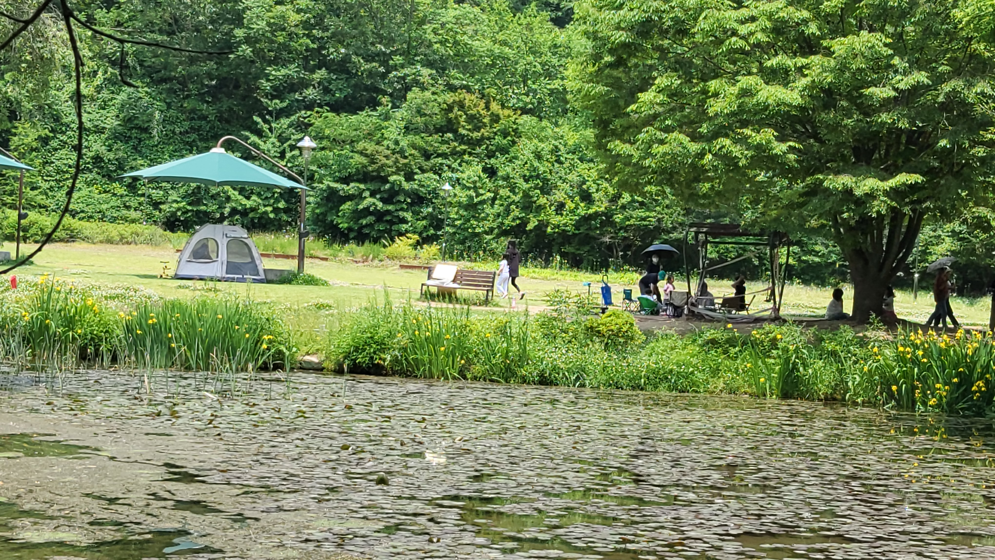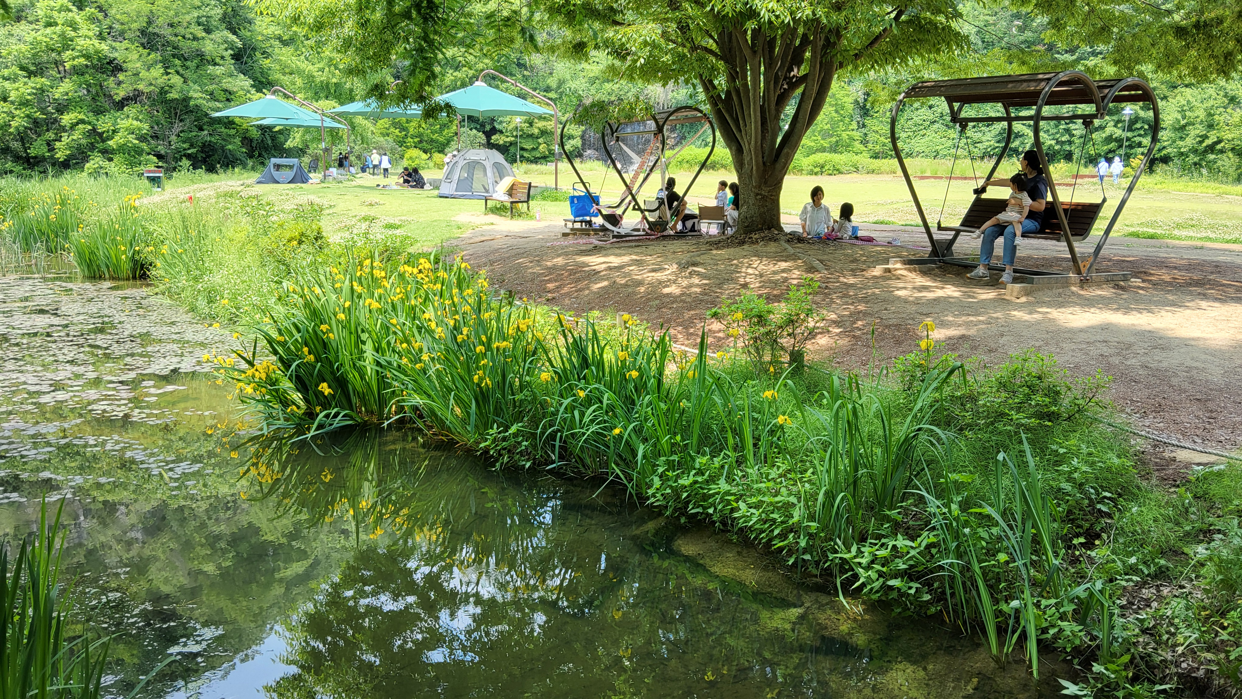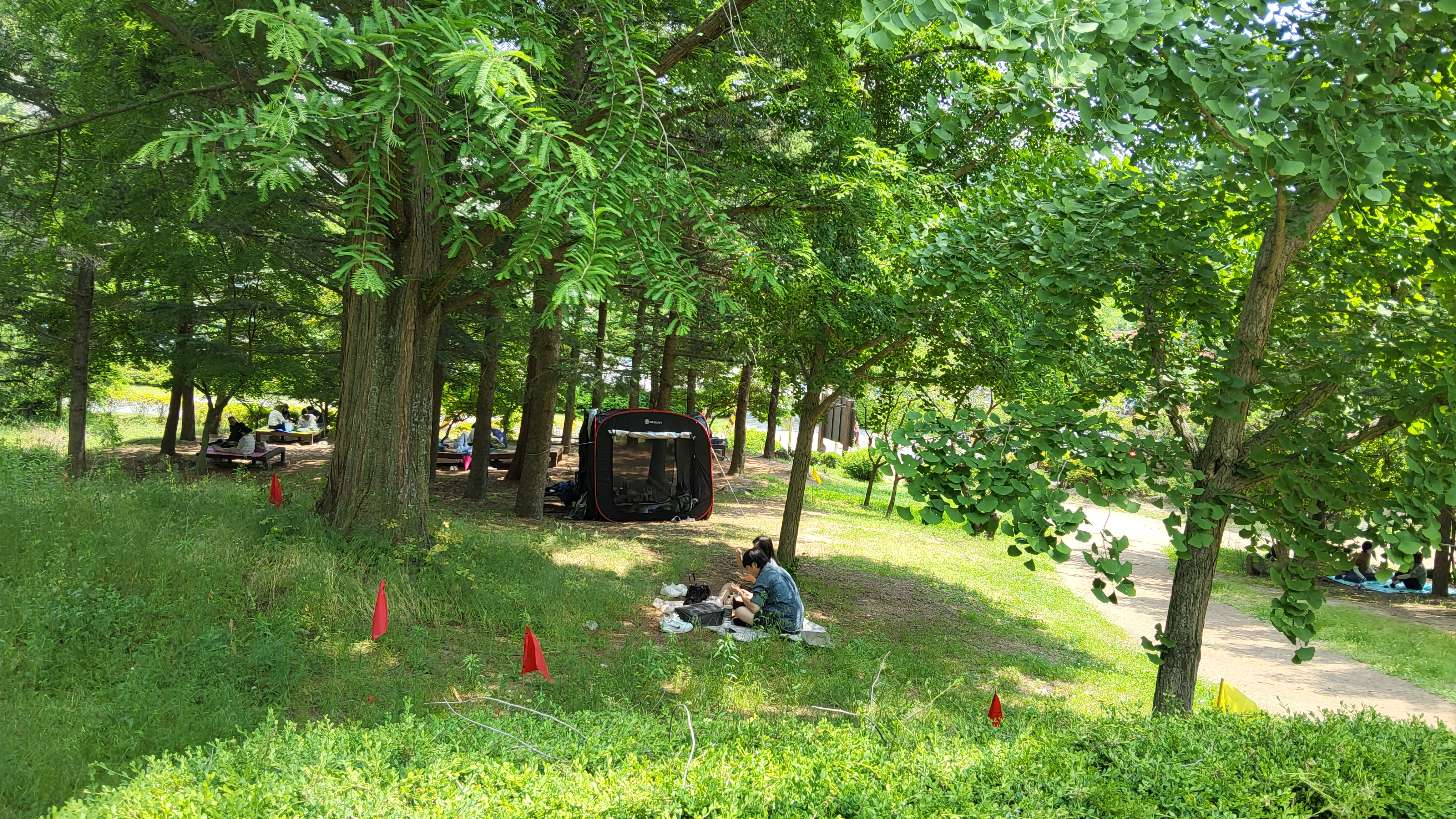 잔디공원에는 가족단위 탐방객들이 여러모형의 텐트를 펼치고