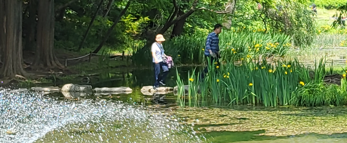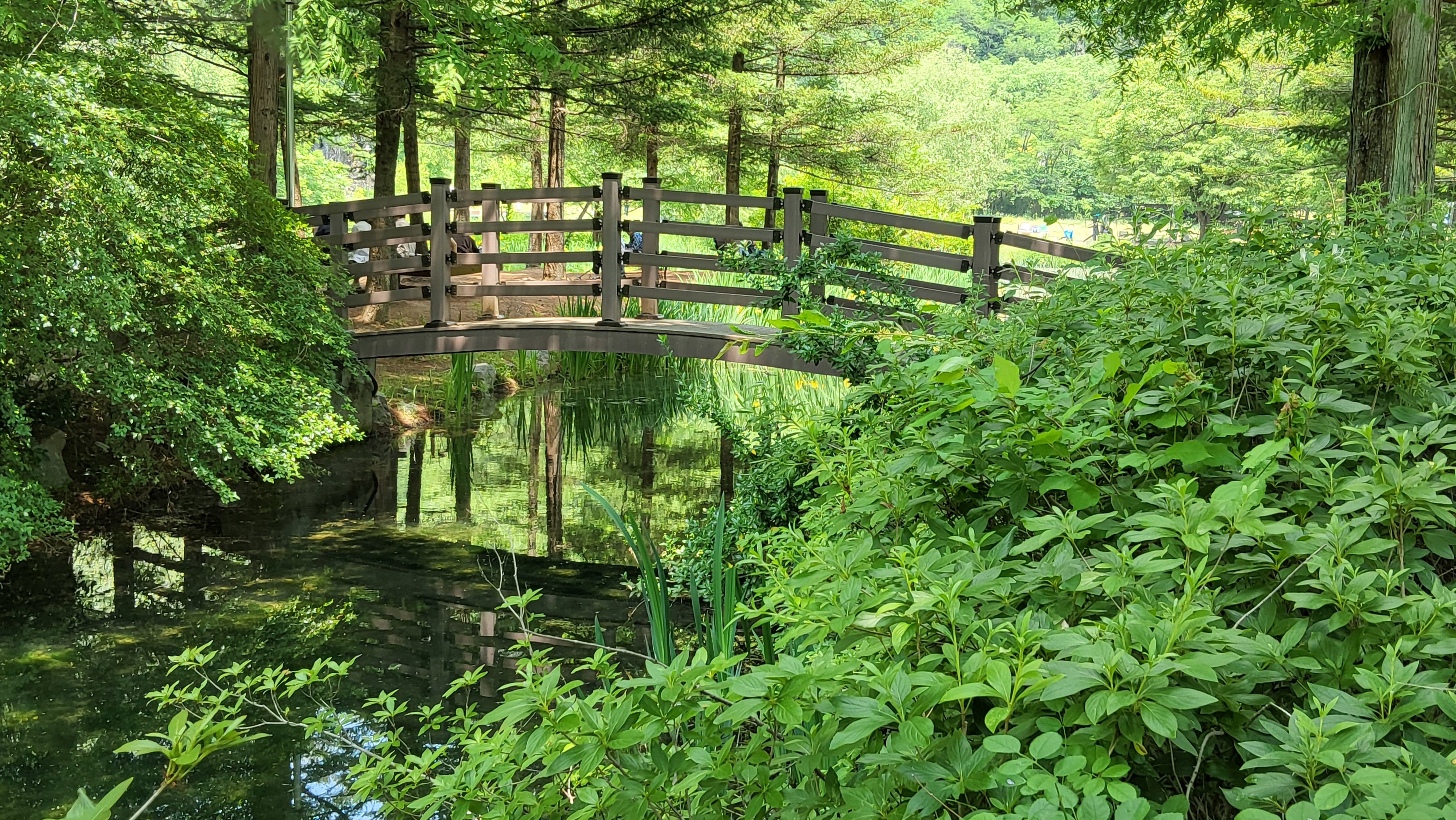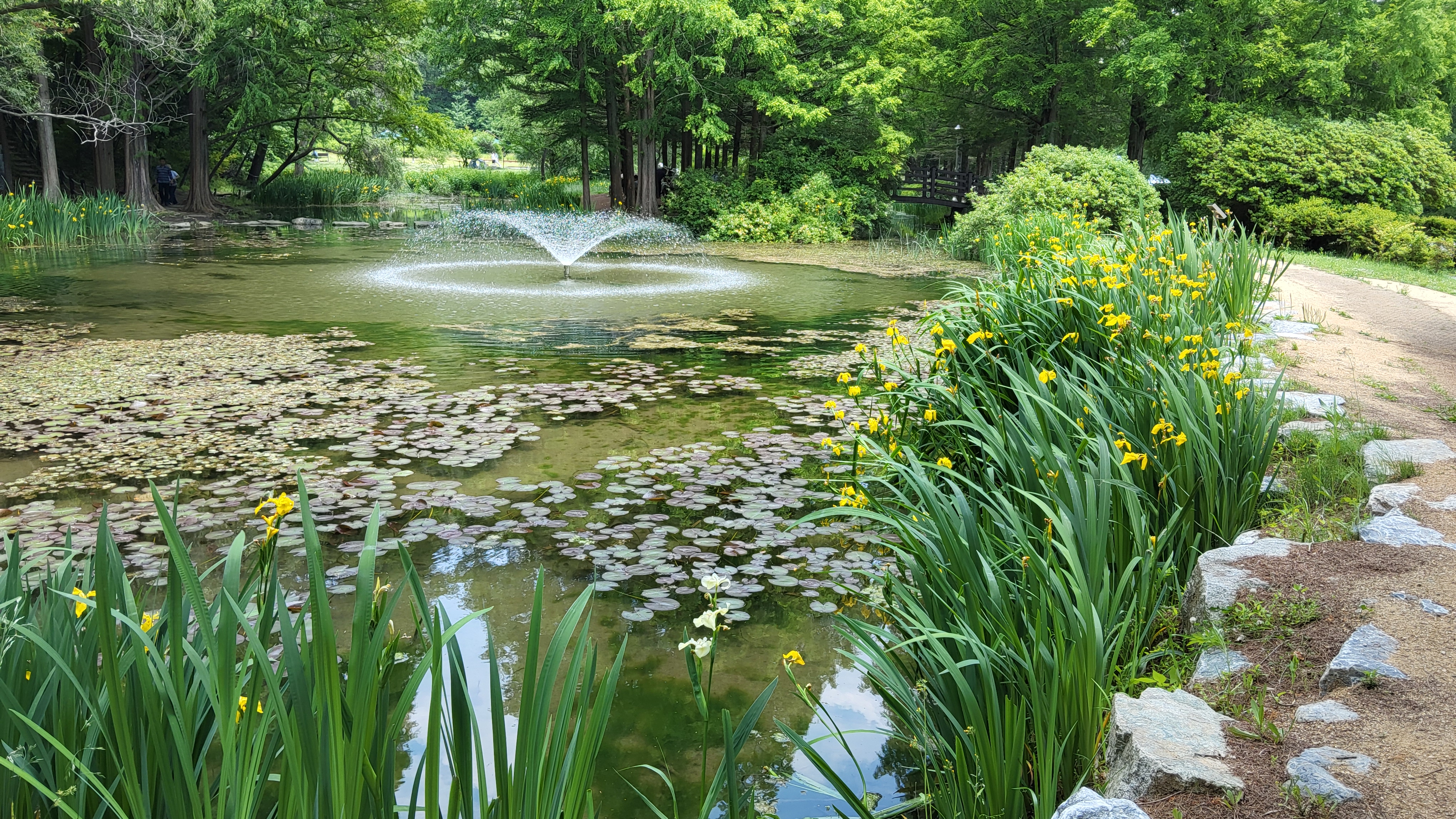 여러식물이 자라는 연못에 설치된 무지개다리와 징검다리에는