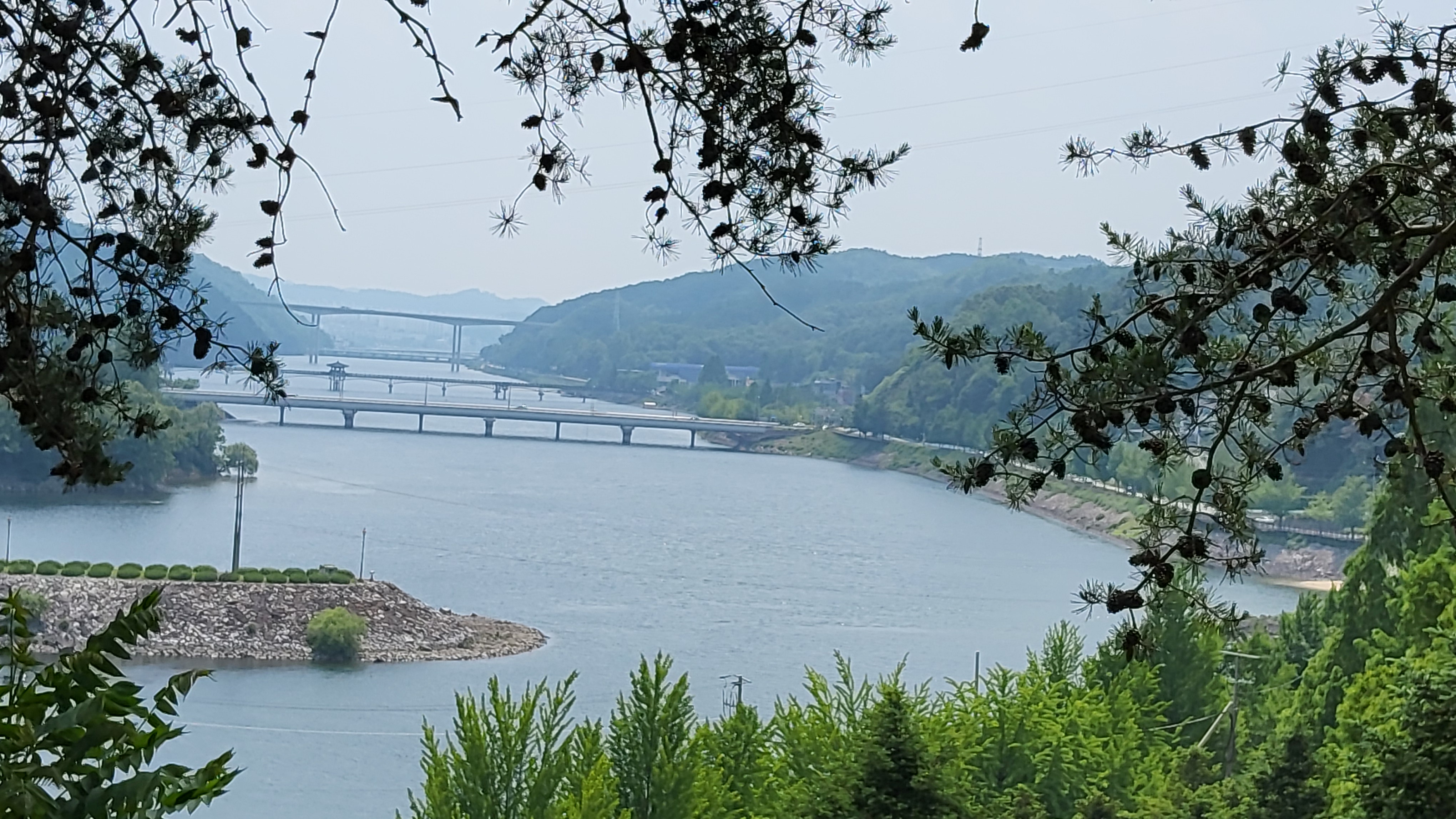 댐 정상으로 숲길을 올랐더니 안동댐 하류가 잘 보아는 곳에