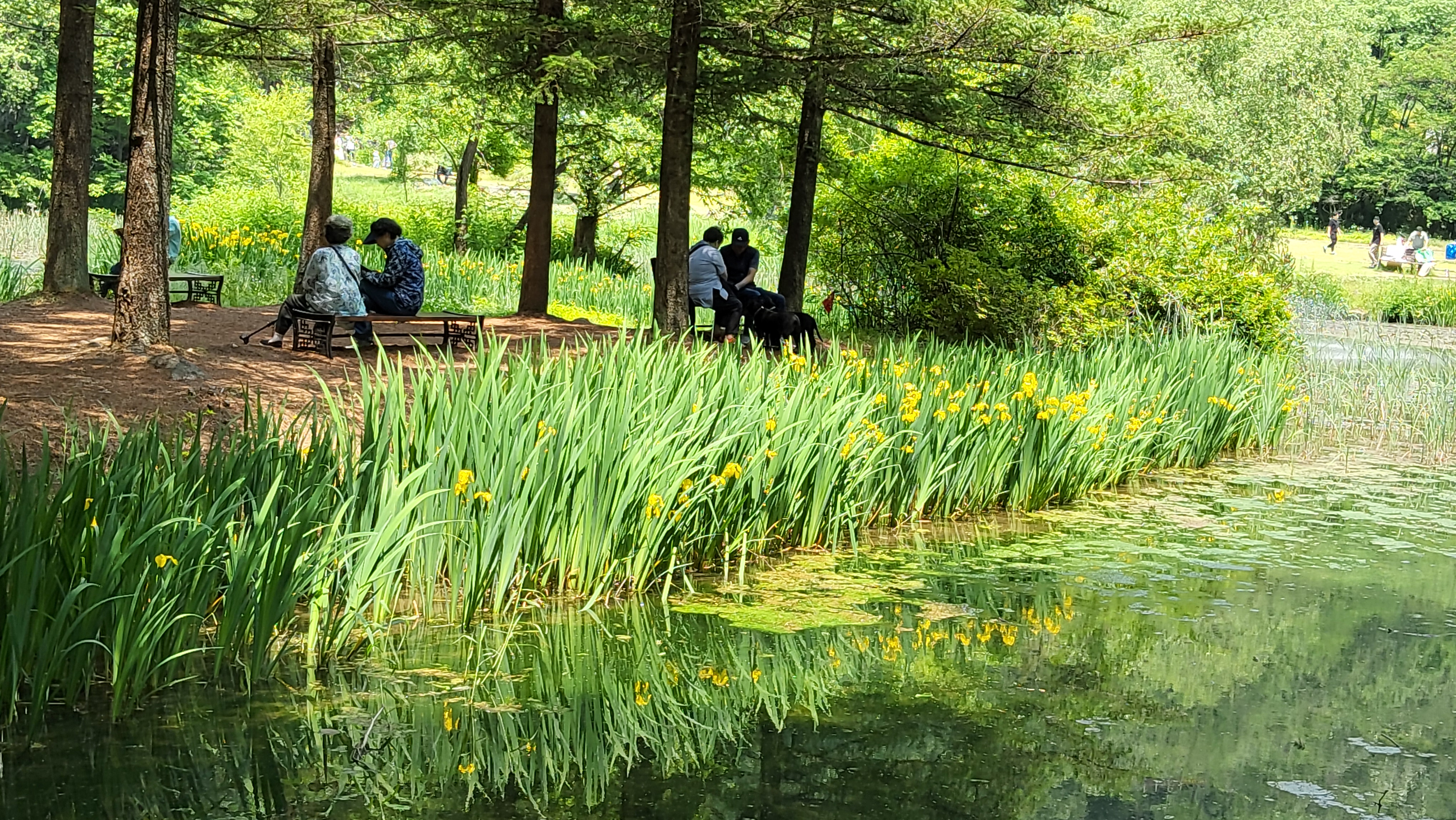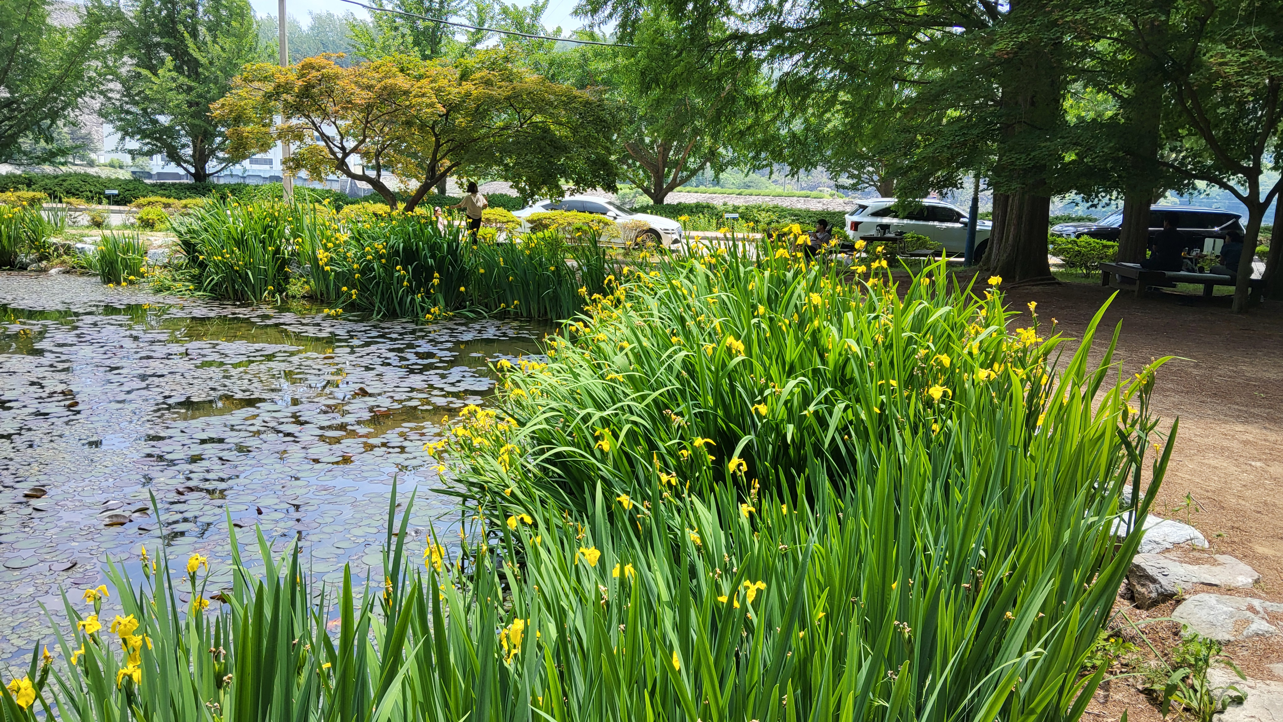 연못가에 심어진 꽃창포가 노란꽃과 흰꽃이 만발하여 반겼으며