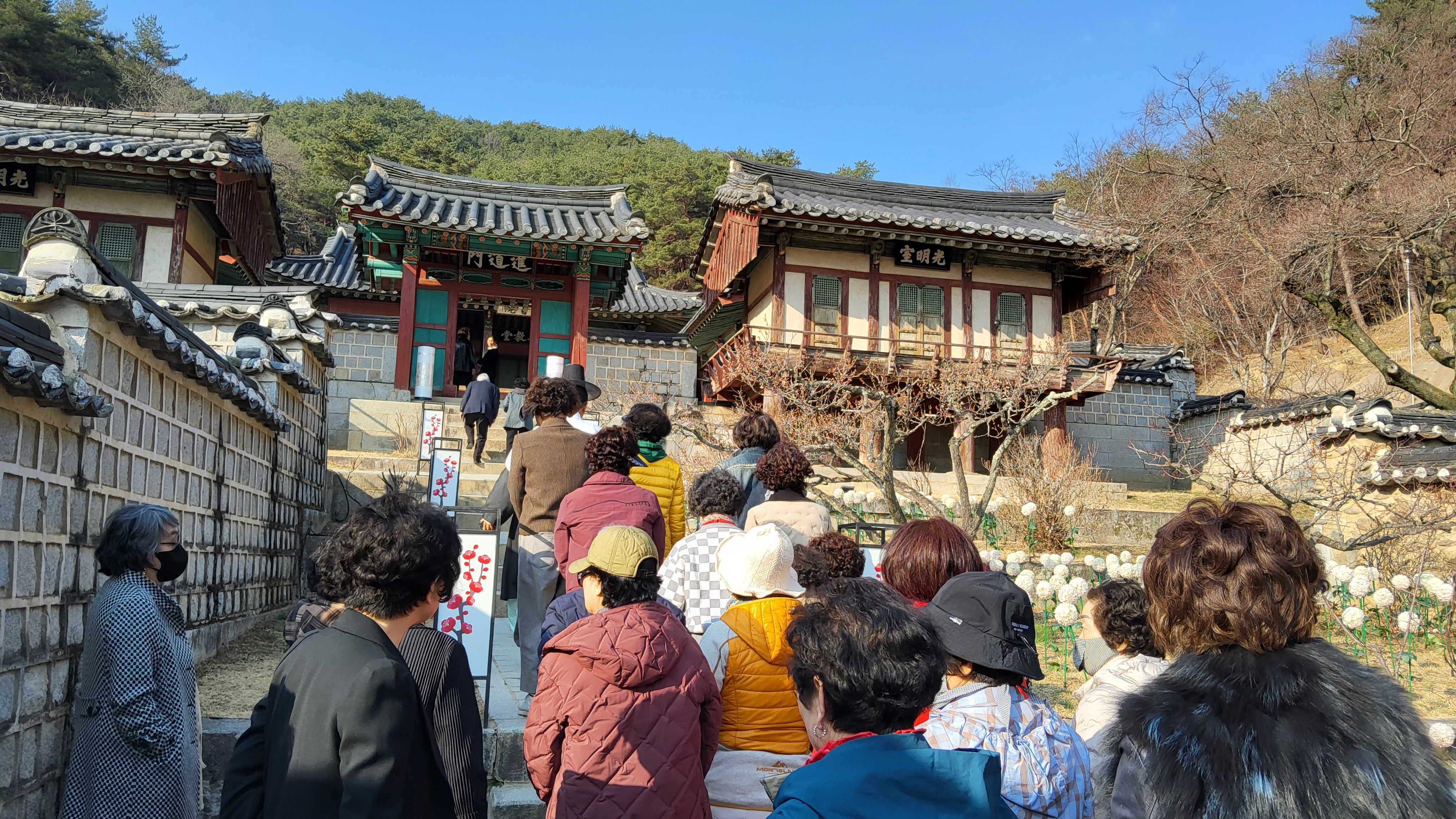 서원앞 광장에는 매화꽃을 장식하여 포토죤과 휴게공간을 설치하고